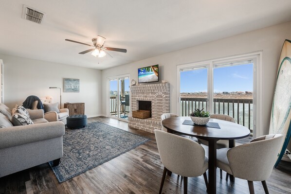 Take in the last of the days sunlight from this well furnished comfortable modern living space. There is a flat panel streaming television, The queen sleeper sofa is perfect for kids and extra guests. Off the living area is the West facing balcony overlooking Lake Padre and boat slips.