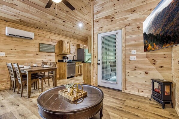 The open living and dining area is bathed in natural light, creating a warm and welcoming ambiance. In the living room, you'll find a generously-sized flat-screen TV, perfect for movie nights or catching up on your favorite shows. For extra accommodation, there's a comfortable sleeper sofa available, ensuring everyone has a cozy place to rest.