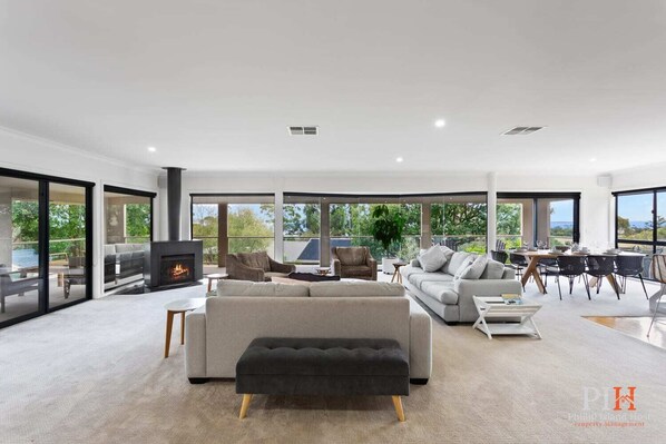 Inside, the grandeur continues with a large indoor fireplace serving as the heart of the home, creating a cozy ambiance on cooler evenings. The floor-to-ceiling glass walls spanning from side to side ensure that whether you're lounging in the living area with a wall-mounted Split system, preparing a meal in the kitchen, or dining at the table, you'll always have uninterrupted views of the glistening ocean.