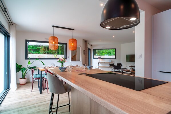 - A fully-equipped open-plan kitchen: kettle, oven, microwave, toaster, dishwasher, hob, etc.