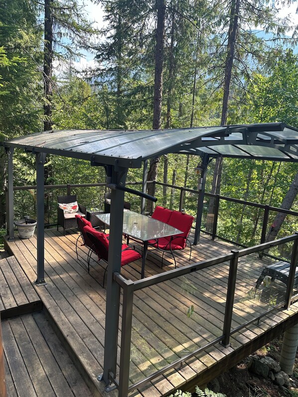 Covered private deck overlooking the creek. BBQ (propane tank) provided. Wood shed with larch and fir available for the fire pit (seasonally) and wood burning stove. There is also an infrared heater on the wall in the living room.