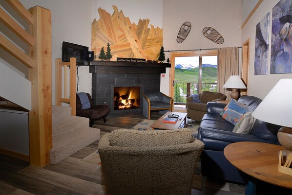Når du går inn i leiligheten, finner du et mudroom-område for god lagringsplass og enn du går inn i det fullstendig renoverte og fullt utstyrt kjøkken. Nydelig granitt og nye skap hjelper til med å aksentere et nydelig sted å lage mat. Like utenfor kjøkkenet har du et spiseplass med plass til 8 ved bordet med 3 ekstra barstoler for å sitte på bartopen. Utover spisestuen er et komfortabelt boareal med sofa og 2 stoler. For å legge til en hyggelig atmosfære til enheten, vil du også nyte gasspeisen som har blitt fullstendig renovert med ny flis. Til høyre for kjøkkenet finner du 2 soverom med eget bad. Hovedsoverommet har en king size-seng og en dør til dekk for å nyte utsikten. Gjestesoverommet i denne etasjen har 2 enkeltsenger i den. Alle badene i enheten har badekar / dusjkombinasjoner og enkle vasker. Gulvene i mudroom, kjøkken, spisestue og stue har også blitt erstattet. Det er en stor dekk utenfor stuen for å nyte noen virkelig fantastisk utsikt.