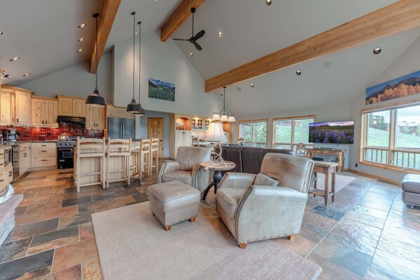 On the main floor there is one bedroom with a Queen bed and bathroom. The oversized bathroom has a steam shower. The expansive, vaulted living room and fully stocked chef's kitchen are also located on this level. The spacious gourmet kitchen has Bosch and Viking appliances, granite countertops, 2 dishwashers and is fully stocked with all the cooking and serving dishes you may need. There is ample room for all convene at the dining table for family style meals. The large leather sofa comfortably seats up to 8 adults. This room also offers a beautiful stone, gas fireplace and comfortable seating which makes it unbelievably cozy year around. The large west facing deck just off of the living space has a grill, table and seating for eight creating a place for a meal with an incredible view! Sunset, anyone?