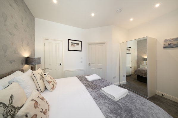 Accommodation for 6 over two floors; Ground Floor: Five steps up to front door into Entrance Hall with stairs to first floor; Living room with 65" Smart TV and Dining area; Kitchen with gas hob & electric oven, and 2 ovens, washing machine, Dishwasher, 50/50 Fridge Freezer, Microwave, Air Fryer & Slow Cooker; Tumble drier (located in cupboard off the living room), Iron & Ironing Board. Twin Bedroom (with Zip ‘n' Link beds which can become a Super King bed) with ensuite wet room with shower, wash basin and WC.