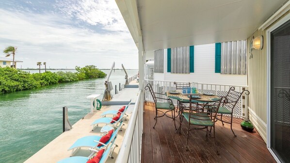 TIDEWATER VIEWS is a cozy 820 square foot cottage that has everything you want for the perfect tropical vacation: open water views from a covered porch, a private 35-foot boat slip, kayaks, bikes and access to the wonderful amenities at Venture Out, a residential community with a heated 80-foot pool with large Jacuzzi and Kiddie Pool, tennis courts, basketball court, bocce courts, swimming lagoon, marina and convenience market with fuel on site and two double wide boat ramps, Recreation Center with billiards, darts, and ping pong, post office and a library. Venture Out has 24 Hour Patrolled Security.