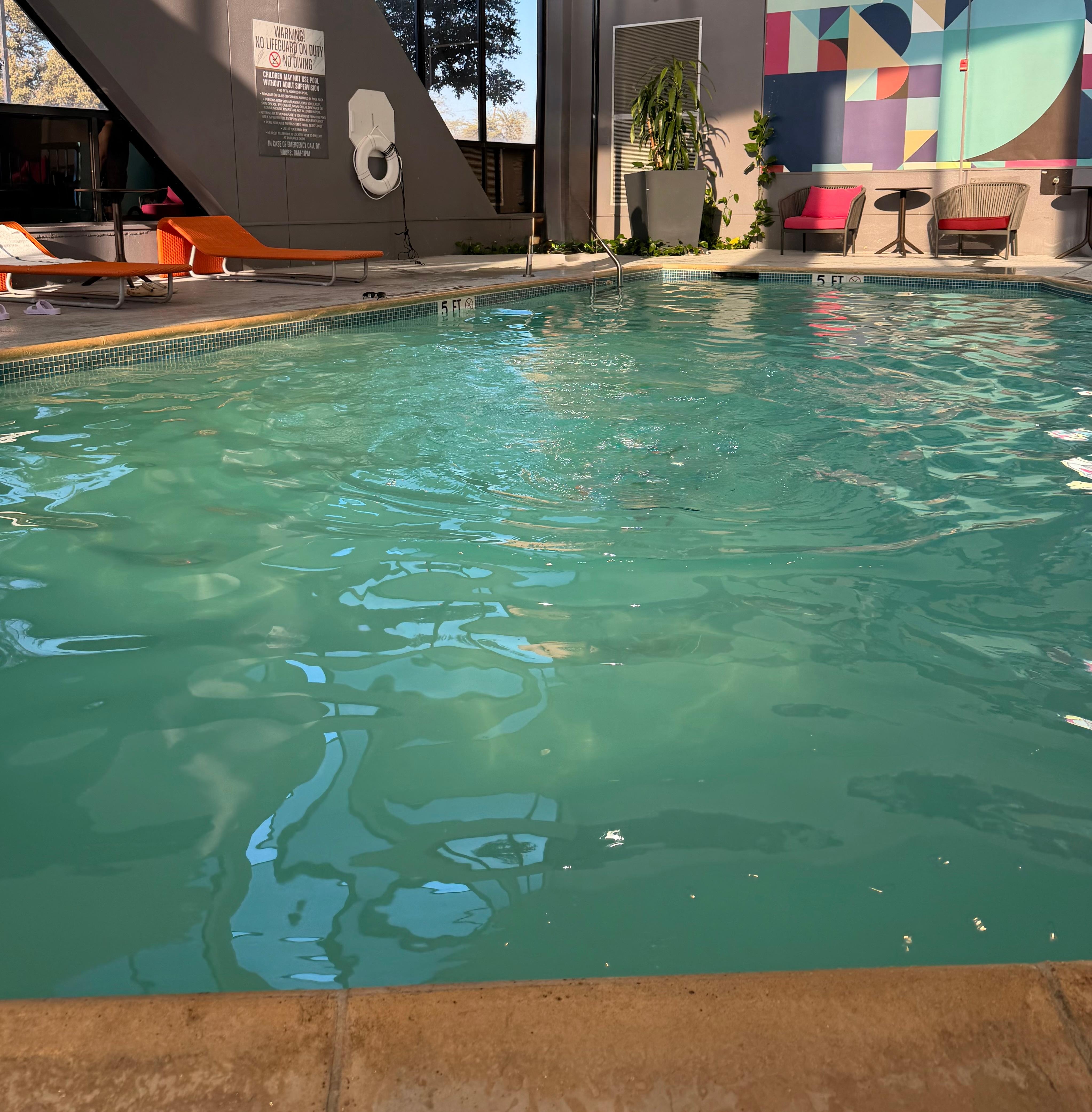 Innendørsbasseng med solsenger