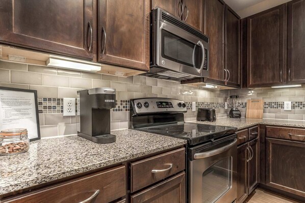 *Microwave, coffee maker (with complimentary coffee), toaster, blender, food processor, pots and pans and basic spices for cooking.