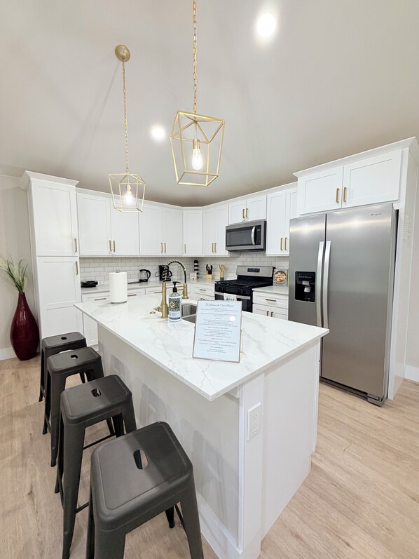 **Modern Kitchen: Fully equipped kitchen with stainless steel appliances, including a dishwasher, microwave, and coffee maker.