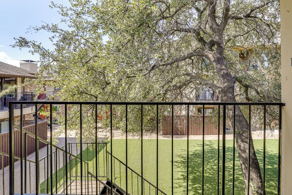 Gjesterom med airconditioning på Walk to Lower Greenville: Couples & Work Retreat har takvifte. Rommene har balkong. Gjesterommene ved denne leiligheten med 3 stjerner har kjøkken med komfyrtopp, mikrobølgeovn, gryter og panner/tallerkner/kjøkkenutstyr og oppvaskmaskin. Badene har badekar eller dusj.