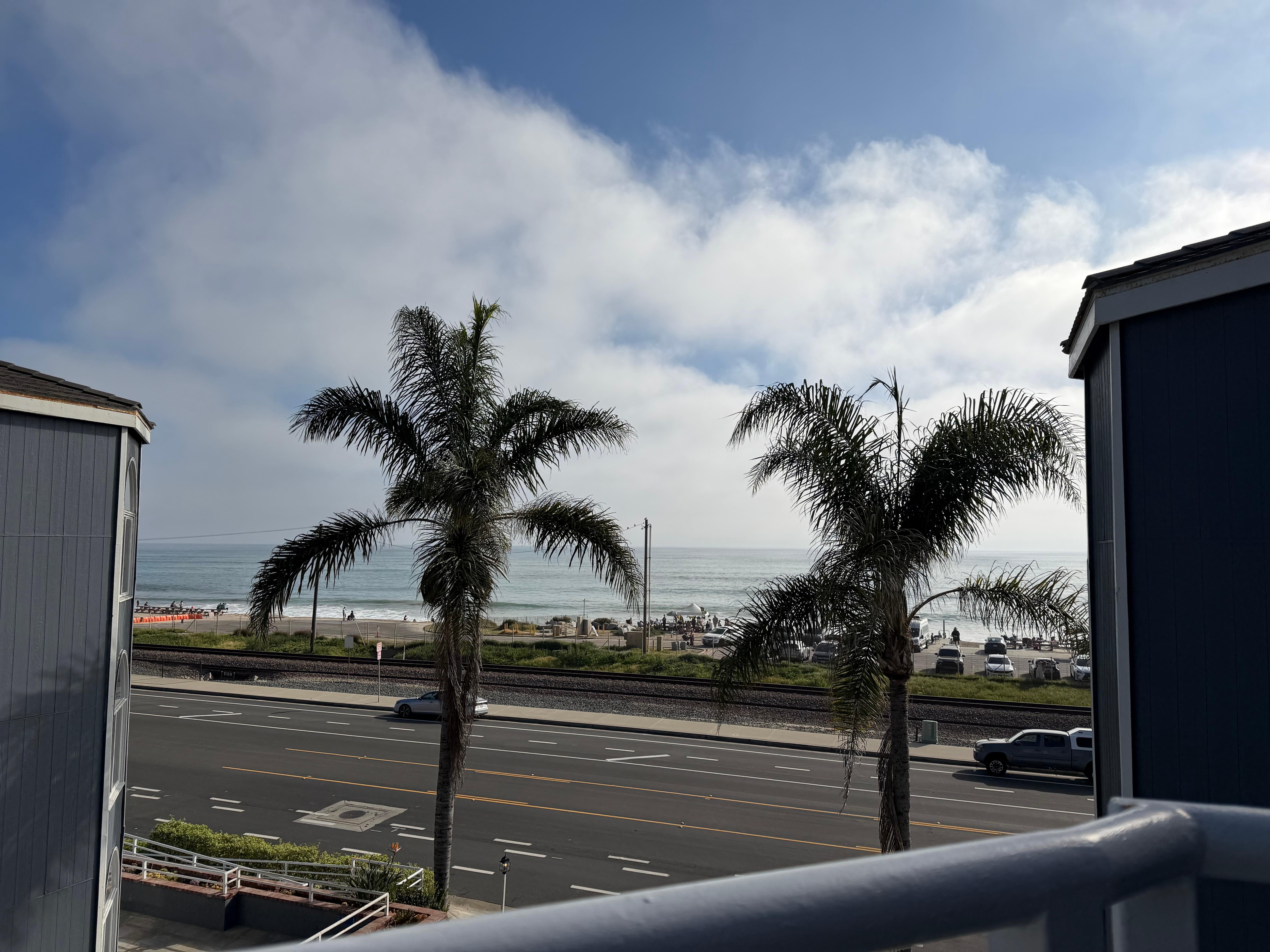 Balcony had ok ocean view. Kitchen was barely functional. Fridge was too small and no counter space. Bathroom was tiny and needs help - the fan is super loud and TV in bedroom doesn’t pivot so not really viewable from bed. Train and traffic were noisy. You can’t access beach without driving a short distance.
