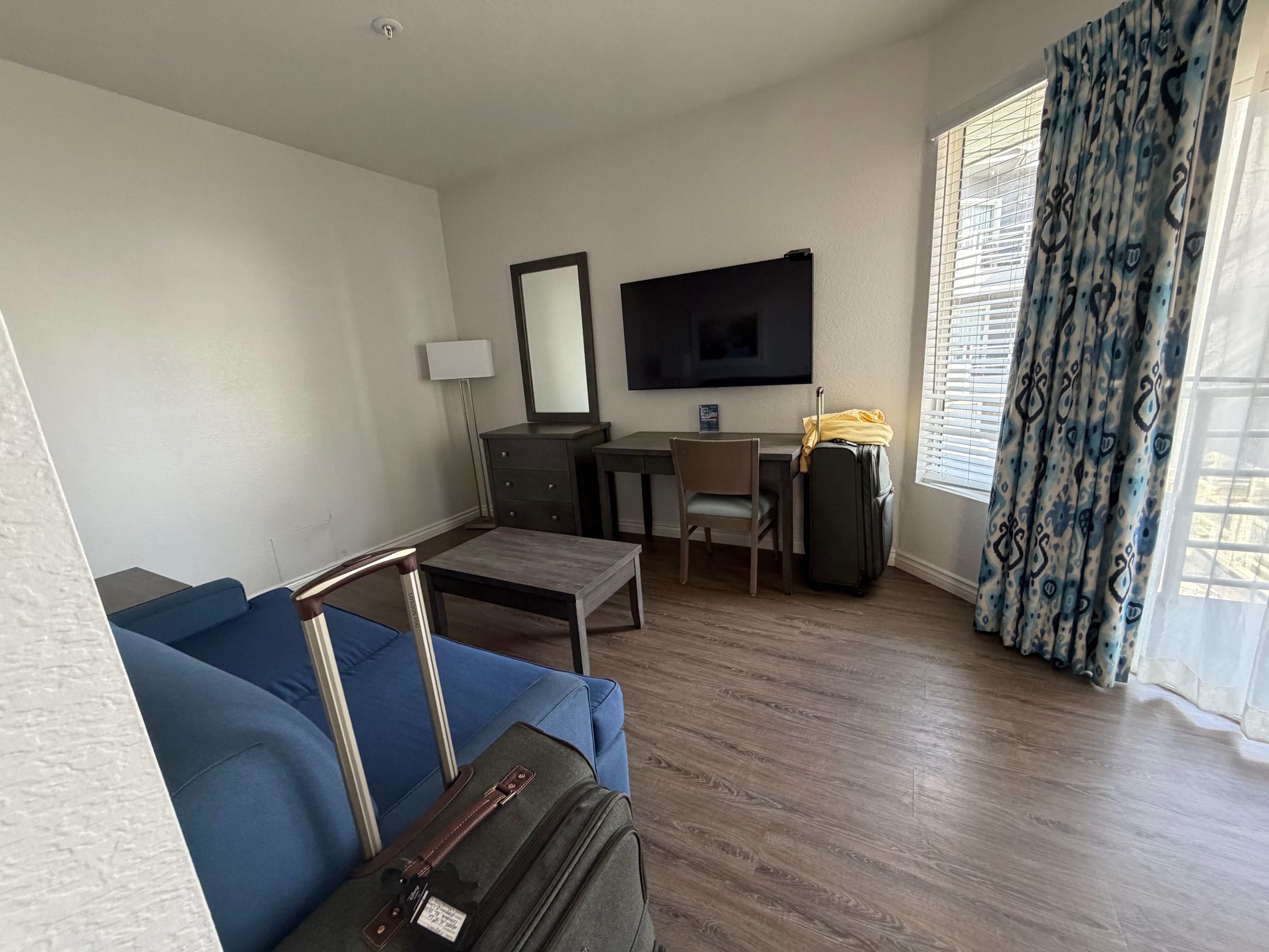 Room was a good size, very dated but bed was clean and comfortable. We didn’t go into hot tub but was told it doesn’t have jets so it is just a hot bath. Probably wouldn’t stay again, but if the price is right then it is an easy stay on your travels.