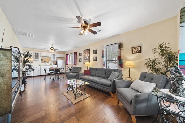 Living Room: Kick back in style! Our living room features a fabulous retro-style TV cabinet housing a 50” flat screen and a 32” sound bar. Get ready for a movie night with Roku streaming your favorites on Netflix, Peacock, or Hulu! Enjoy modern furniture with a vintage twist, all flowing seamlessly into a charming 50`s diner-style dining area and a fully retro kitchen.