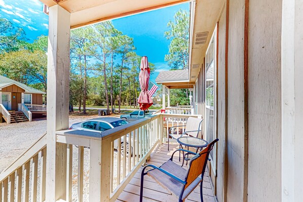 Continue to soak up the sunshine from the condo's front deck, furnished with chairs. Right inside, you'll immediately feel at home amidst the living room's leather seating and large smart TV. The adjacent kitchen is well-equipped for meals in and the wooden dining table is a great space to host family meals. The mini fridge is ideal for additional beverage storage.