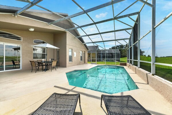 - Private Screened Southwest Facing Swimming Pool with Patio, Outdoor Furniture with Seating for 6 plus 2 Chaise Lounges