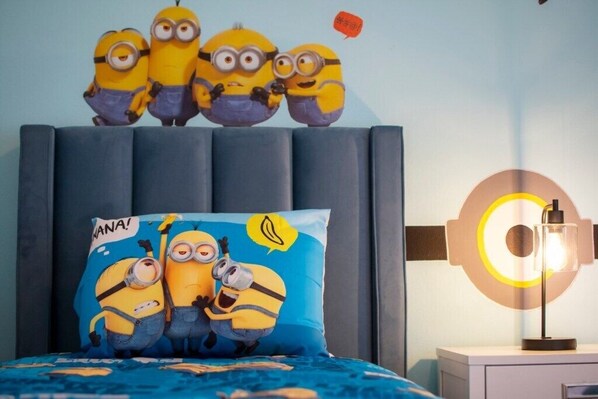 - Minions Twin Suite: Two twin beds with vibrant Minion decor, sharing a full bathroom with the Second Queen Room.