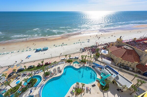 Room was dated and older with frayed carpet, cracked tile and not all electrical sockets worked. Smoke detector kept going off and had to be removed, even after new batteries were placed in it. Balcony is spacious however there is a narrow dividing wall between you and your neighbors so they can easily see onto her balcony. Floors and chairs could use a good cleaning. I would give the room three out of five. Elevators were not all working on the busiest day of the year. However, the rest of the facility was top-notch. Great Pools, bar, slide, and amazing security. They were very helpful. Check-in was a breeze. Excessive amount of homelessness around the property. However security measures with locked gates was very helpful. Would stay here again but at a deep discount. Not really worth what was paid.