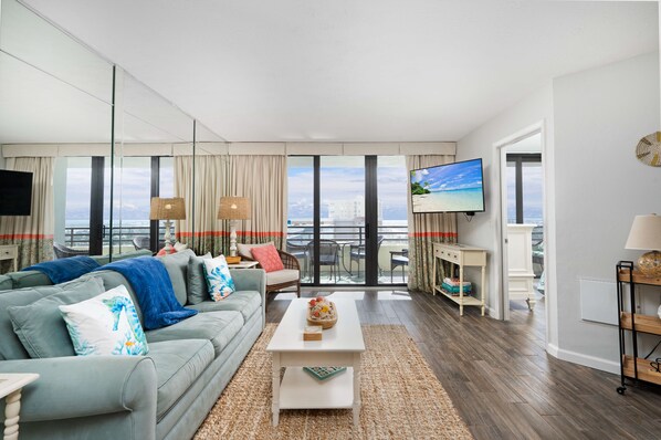 When you enter this unit the ocean views will take your breath away! The ocean view balcony can be accessed from the living room as well as the primary bedroom. The living room includes comfortable furnishings, a large flat-screen television, a sleeper sofa, and stunning ocean views. The kitchen comes fully stocked for all your cooking needs and overlooks the dining area with seating for 6 as well as 4 additional bar stools.