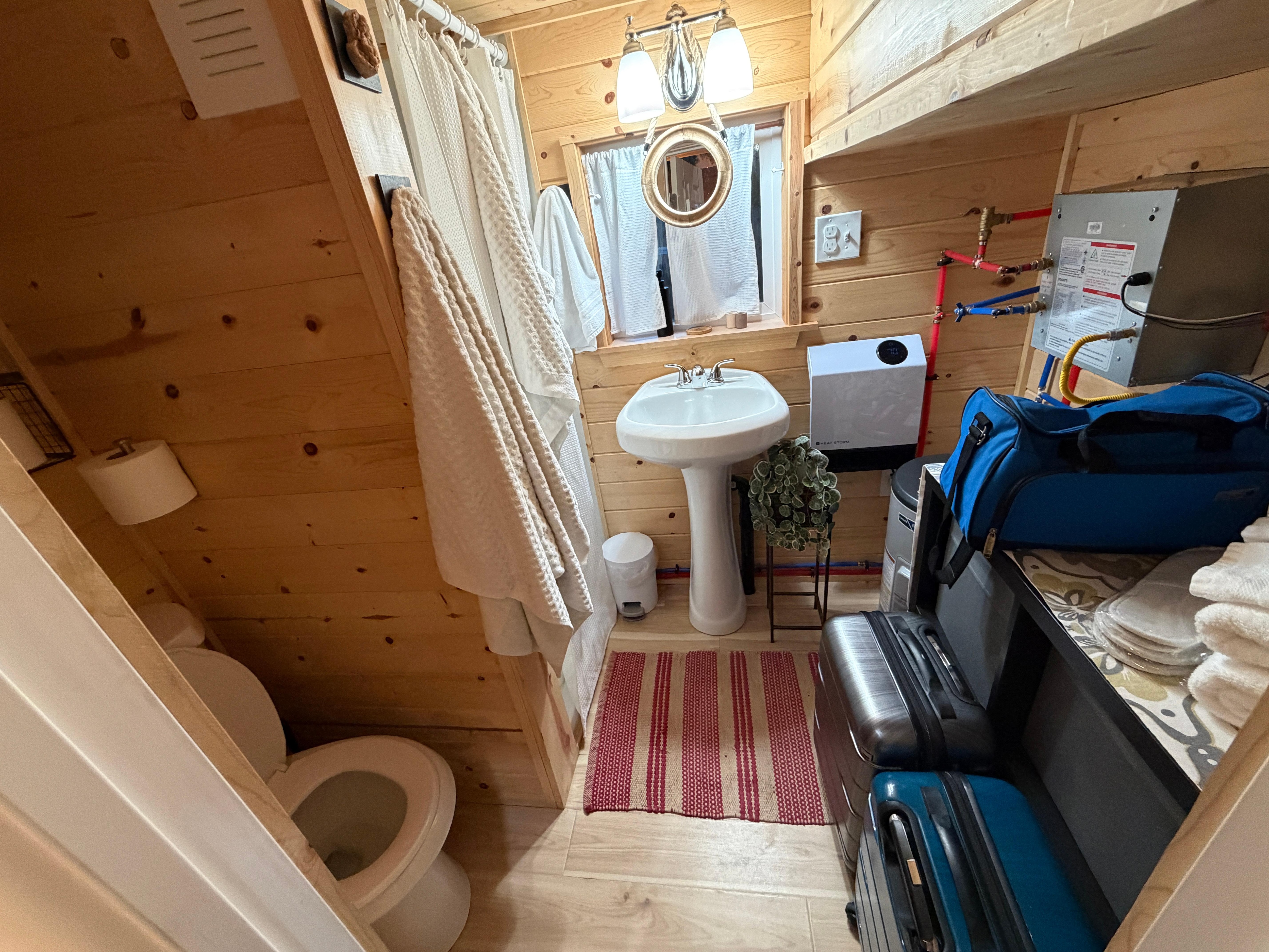 We have space for storage items within the tiny home loft for longer-term stays, but space is limited. The kitchen comes equipped with a medium-sized air fryer/toaster/oven unit.