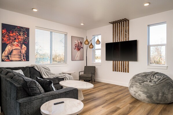 Enter the home to light and bright amazing living room and gourmet kitchen. You have a formal dining table and 5 barstools across the kitchen island to hang out and eat at. The main level is an open floor plan with room to spread out and has direct access to the private backyard. The upstairs has 3 bedrooms, 2 bathrooms, and the laundry room. The primary bedroom is huge bedroom with king bed, huge closet, and amazing master shower and vanity. The other 2 upstairs bedrooms have queen beds and share a jack & jill bathroom. The basement has 2 more bedrooms and another full bathroom. One bedroom in the basement has full size bunk beds and the other room has a queen bed. The fenced backyard has a BBQ and sitting chairs and table ( we provide the grill but not the propane). There is a 2 car garage and driveway to accommodate at least 4 cars off street. There is street parking for overflow parking in front of the lot to the north of the home. Please do not block the neighboring homes.