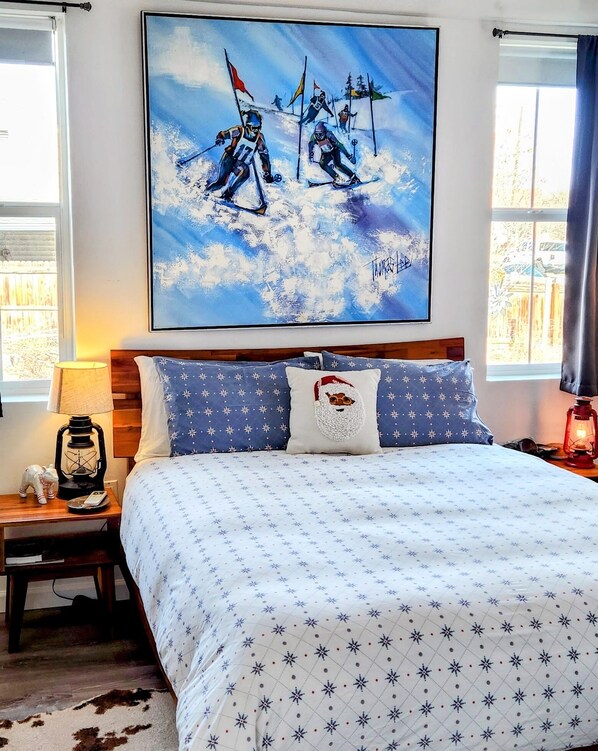 ◉ Queen size bed flanked with windows