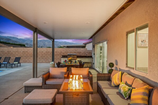 Desert Retreat is a beautiful 4 bedrooms with comfortable sleeping arrangements that all guest have a restful sleep. Each bedroom is elegantly furnished with plush bedding and the master suit with 65 inch tv, master bathroom features a soaking tub. Dessert Retreat has 3 full bathrooms. The house has dining area for 10, with outdoor kitchen w/ gas grill. Endless entertainment awaits soccer field, ping pong table. Enjoy the amazing view of the mountain all around Desert Retreat.