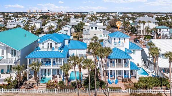 With its signature white picket fence, columned covered porches, and wrap-around balconies, At Last! blends classic coastal architecture with modern comfort — plus a private pool, expansive living spaces, and an unbeatable location near restaurants, shopping, and beachfront attractions.