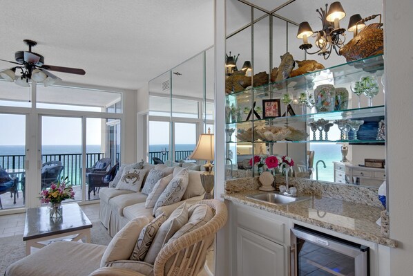 Vår feriebolig er som ingen andre i Jade East. Vi har spart ingen utgifter i å skape den slags luksusferie som du vil bli overrasket over fra det øyeblikket du satte foten på eiendommen. Vi har sørget for at ferien condominium har alt du trenger for å nyte oppholdet hos oss. Du finner at leiligheten vår ikke bare er romslig og godt vedlikeholdt, men vi fortsetter å legge til spesielle detaljer som gjør det til det perfekte miljøet for en fantastisk og avslappende ferieopplevelse. Det er hjemme, men bedre. Tross alt ligger den på verdens vakreste strand. Og fra dette fantastiske stedet vil du nyte en fantastisk utsikt over Gulfen, du ser gjennom skyvedører som åpner for en ekspansiv balkong. Uansett hvor vakkert vi har gjort inne, finner vi oss selv mye tid her på grunn av den fantastiske utsikten over stranden og golfen. Når vi kommer ned, tar vi med kikkert for å nyte delfinene mens vi har vår morgenkaffe. Pass på at du tar tid som vi gjør for å nyte de fantastiske solnedgangene som er den perfekte enden til en spennende dag - - eller begynnelsen på en fortryllende kveld. Denne komfortable balkongen er bare begynnelsen på hva vi tror gjør ferien hjemme hjemmefra ganske spesiell.