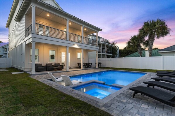 Steps from the beach in Crystal Beach, Destin! Majestic Moon is a luxury 8BR/8BA home sleeping 23, featuring a private heated saltwater pool, waterfall hot tub, fenced yard, and included 6-seat golf cart. Walk to the beach, cruise to Destin Commons, and enjoy spacious living, king suites, and kid-favorite bunks—perfect for family and group getaways.