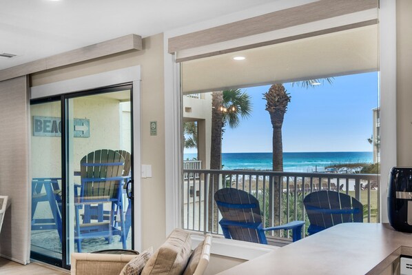 * Gulf Views fra balkongen, stue og kjøkken