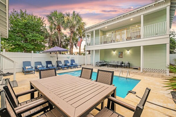 BACKYARD: Relax in your own private tropical oasis with a sparkling pool, a patio table for six, plenty of lounge chairs, and a grill for outdoor meals and entertainment.