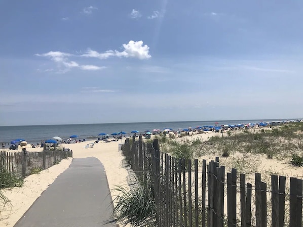 There are no streets to cross to get to the beach, so you don't have to play Frogger to get to and from the beach (the Condo is on the Beach Block in Dewey Beach, Delaware—5 buildings/homes to the Sand Dunes for the Atlantic Ocean).