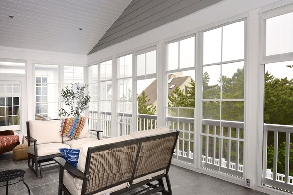 Comfortable and gorgeous living room furniture with one of two fireplaces, ocean, and bay views. Off the 3rd level living room, you will enter the screened-in porch with fireplace, seating, and views of the pool area below.