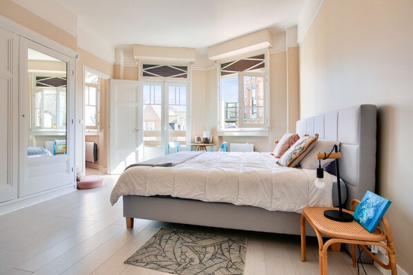 The interior of the apartment will not leave you indifferent either, with its colorful and careful decoration. Its spacious living room with its turquoise wall and its large windows where you can even see the sea invites you to a moment of relaxation in front of the television, or to enjoy a good meal around the dining table. The independent kitchen, for its part, has everything you need to make you feel at home: induction hob, fridge, freezer, microwave, dishwasher, Nespresso coffee machine and kettle. What are you waiting for to taste the delicious fresh products from the market?