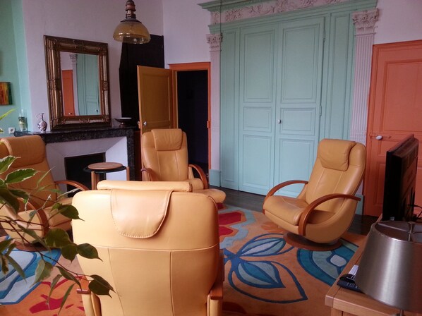 Stuen er innredet med 4 individuelle slappe stoler med fotstøtte eller seter, en stor teppe verdsatt av både voksne og barn. Mulighet for en annen stol. En TV med gratis boksing. WiFi tilgjengelig.
