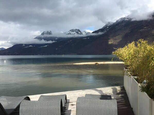 Et fantastisk 50m2 dekk ved vannet tilbyr kundene den perfekte tilgangen til Europas reneste innsjø. Paddleboarding, vannski, kajakkpadling og svømming er til hånden med idylliske vanntemperaturer opp til 26C om sommeren. Spektakulær utsikt over vann og fjell er også et viktig høydepunkt.