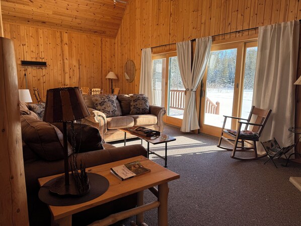 The downstairs Master has an ensuite, a jacuzzi tub and features a queen log bed. The upstairs bedroom has 2 queen beds and ensuite. The living room sofa pulls out to accommodate 2 more. This home will comfortably sleep 8. If you need room for a couple more guests Hermitage Cottage is just a stones throw away and sleeps 2.