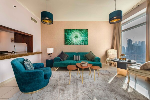 Leiligheten er fullt møblert og har en spisestue og stue med flatskjerm-TV, sovesofa og balkong med utsikt over Dubai Dancing Fountain. Den har 2 bad. En velutstyrt kjøkkenkrok med komfyr, oppvaskmaskin, kaffetrakter / vannkoker, mikrobølgeovn og kjøleskap. Leiligheten har hårføner og vaskerom med vaskemaskin, strykejern, strykebrett og klesstativ.