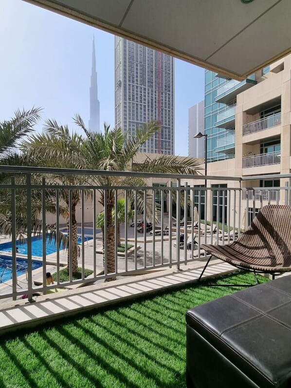 This studio apartment is well-furnished with a comfortable bed and spacious closets along with a glass window in each. The living space and bed space are separated and have separate TVs. The living space has a seating arrangement for up to 4 people. The kitchen is fully equipped with high-end appliances. The balcony has a Burj Khalifa view and a pool view.