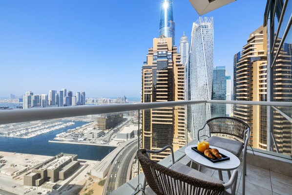 The main balcony offers breathtaking views of Dubai Marina and the Arabian Gulf, making it the perfect spot to savor a morning coffee.