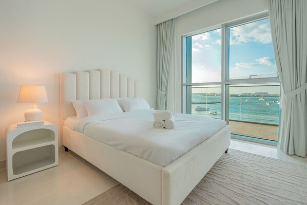 Luksusleilighet, 2 soverom, sjøutsikt | Blendingsgardiner, strykejern/-brett, wi-fi (inkludert) og sengetøy