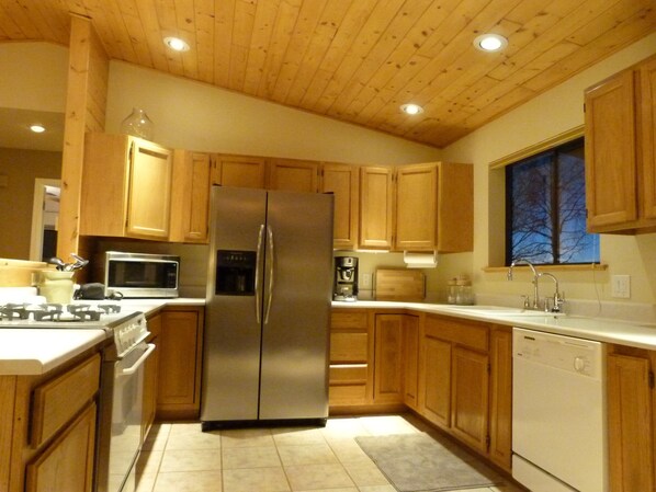 Dette huset har et kjøkken som vil glede enhver kokk. Stor og U-formet, åpnes det til stuen, noe som skaper en ideell plass for å underholde. Rikelig counter plass, high-end utstyr, og en gasskomfyr alle lage en enkel og åpen plass til å lage mat. Plenty av retter, panner, og selv fine kokker kniver er gitt. Du kan regne med fine gryter og panner, gode kniver, kaffekanne, mikrobølgeovn, brødrister, crock-pot og blender for å lage måltider uanstrengt. Hvis du liker å lage mat, vil du elske dette kjøkkenet!