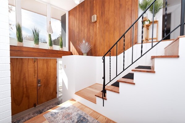 This is a unique opportunity to stay in a residence originally built in 1962 and designed by one of Frank Lloyd Wrights students. The residence was completely remodeled and finished in early 2023 remaining true to the period and making it much more than your typical vacation rental. The luxurious home is furnished with high quality period furnishings, Smart TVs with cable in 4 of the 5 bedrooms, a fully stocked kitchen, and beautiful deck with a fire pit and valley views. Central AC was also installed.