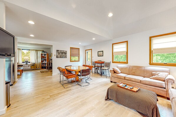 Book this darling, two-story, family-friendly home for that next Cape Cod getaway! Set on a large, grassy lot, this adorable home features a well-equipped full kitchen, a dining table for six for mealtimes or family game nights, and two separate living areas including one at the front of the home with a wood-burning fireplace, and a second area adjacent to the kitchen and dining area with a flatscreen TV and sliding door access out to the deck. And for sleeping arrangements, this home offers four cozy bedrooms with two easy-to-access rooms on the main floor plus two kid-friendly rooms with side-by-side twin beds upstairs.