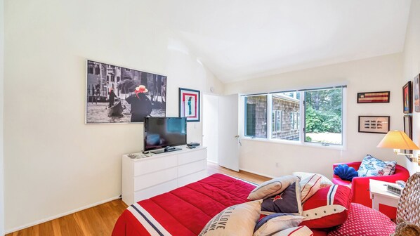 Bedroom 1 - Primary: One King Bed, First Floor/Main Floor, Air Conditioning, Full Ensuite Bathroom, Cable TV, Walk-in Closet, Balcony/Deck