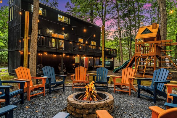back), playground for kids, hot tub, fire pit with 12 Adirondack chairs,