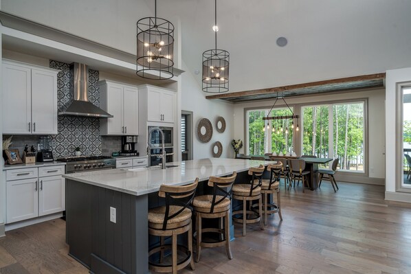 Gourmet kitchen with stainless-steel appliances, dual ovens, farmhouse sink, walk-in pantry, and dual-feature coffee machine.
