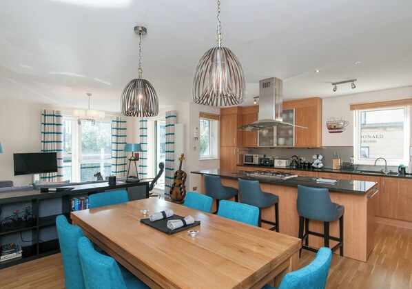 The dining area has a table providing seating for up to 6 guests should you wish to make use of the well equipped kitchen area. This has granite work surfaces and is bordered by a breakfast bar. There is double electric oven and gas hob with overhead stainless steel extractor, dishwasher and plenty of crockery and cookware. An internal utility room houses laundry facilities and has washer/dryer and a sink.
