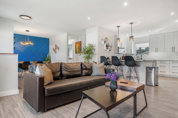 ✦ The kitchen is both stylish and functional, ideal for longer stays. It includes stainless steel appliances, sleek stone countertops, a refrigerator, microwave, dishwasher, and a coffee and tea station featuring a Nespresso machine, drip coffee maker, and French press to meet all your needs.