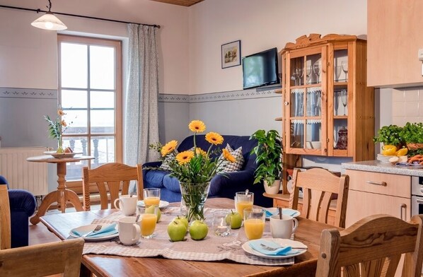 Den "Kampenwand" Bolig er trolig vår "mest tradisjonelle". Siden hun er i andre etasje og har skråtak og fordi det inspirerer med sin sjarmerende delen. Du kommer inn i leiligheten og er lokalisert i den lyse og luftige kjøkkenet. Et moderne kjøkken som passer perfekt med møbler, og tilbyr et godt kjøkken komfort, med kjøleskap, vask, komfyr / stekeovn og splitter nye: en ny: oppvaskmaskin, og tilhørende kokeutstyr, slik som servise, gryter, brødrister, kaffetrakter og bestikk. Ligger på vakre våningshus bord, kan de ta sine måltider eller skralle. I den lille stuen kabinettet på TV, og en CD-radio spiller er. stå på en litt hevet plattform, rett ved døren til Bauer balkong, to små koselige sofaer. Et lyst soverom med en moderne dobbeltseng og to nattbord Kasteln, samt et stort skap har nok plass. En takvindu direkte over sengen (blackout rullegardiner) gir dem et glimt av stjernene. Det lille badet, også med et takvindu, går også ut fra stuen og i tillegg til en kar, som også har et dusjhjørne, eller vask og toalett. Det andre soverommet har også sitt eget klesskap og et takvindu som kan bli formørket. Den enkeltseng kan ta av, og du kan så det skaper en ekstra seng. Leiligheten Kampenwand er også utstyrt med nødvendig sengetøy og håndklær for dem.
