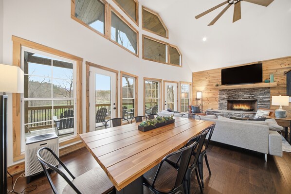 As the sun sets, gather in the open-concept living room with its soaring ceilings and custom finishes. The lower level is the dedicated "Fun Zone," featuring a wet bar, Smart TV, and a foosball table that promises hours of friendly competition.
